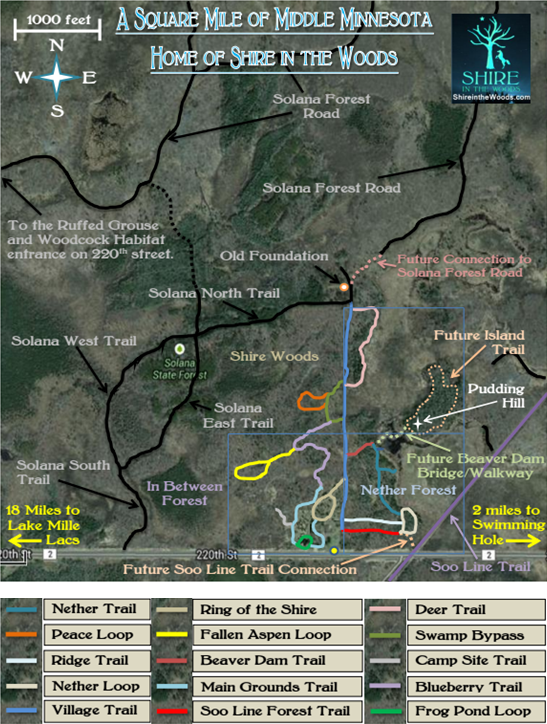 We have several miles of marked and groomed trials around the Shire. You can see the basic trails on the Shire map. There are also many miles of Solana State Forest Trails that can be either reached from the Shire Village Trail or two nearby access points on 220th street (Highway 41 or 2). There is also the Soo Line Trail and its offshoots which go for many miles in either direction. Maps can also be found in the main office. We have barely explored all the trails so if you find interesting features or places please tell us.